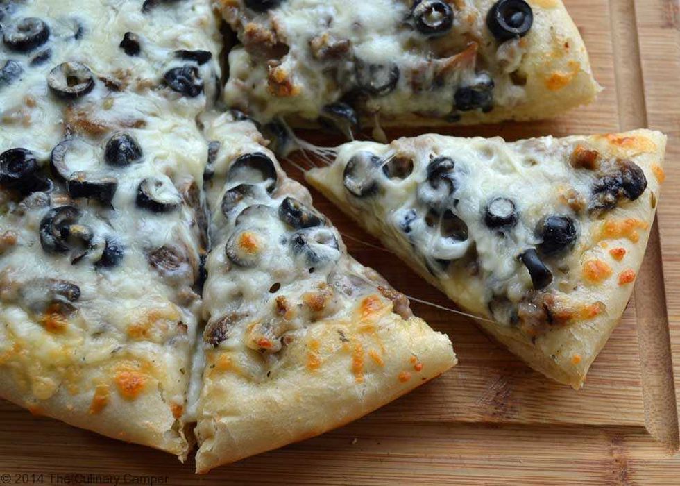 Roll out the dough on a clean flat surface, or press out in a Dutch oven. Evenly spread pizza sauce over the dough. Sprinkle about a 1/4 cup of cheese on the sauce. Place the mushrooms, olives, and sausage...