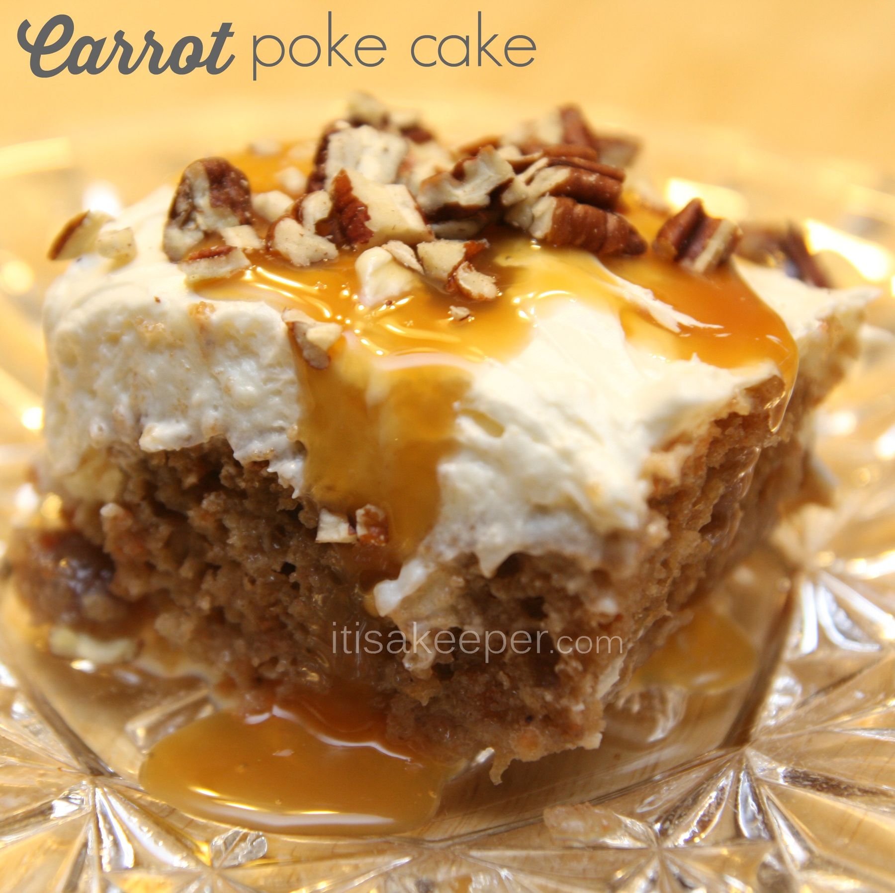 If you love quick easy dessert recipes, then you will love this Carrot Cake Poke Cake! One of my favorite things about this quick easy dessert recipe is it starts with a boxed cake mix. I love how poke cakes are super moist. And, this one is no exception. Moist and flavorful with an easy fluffy cream cheese frosting. And caramel! And nuts!