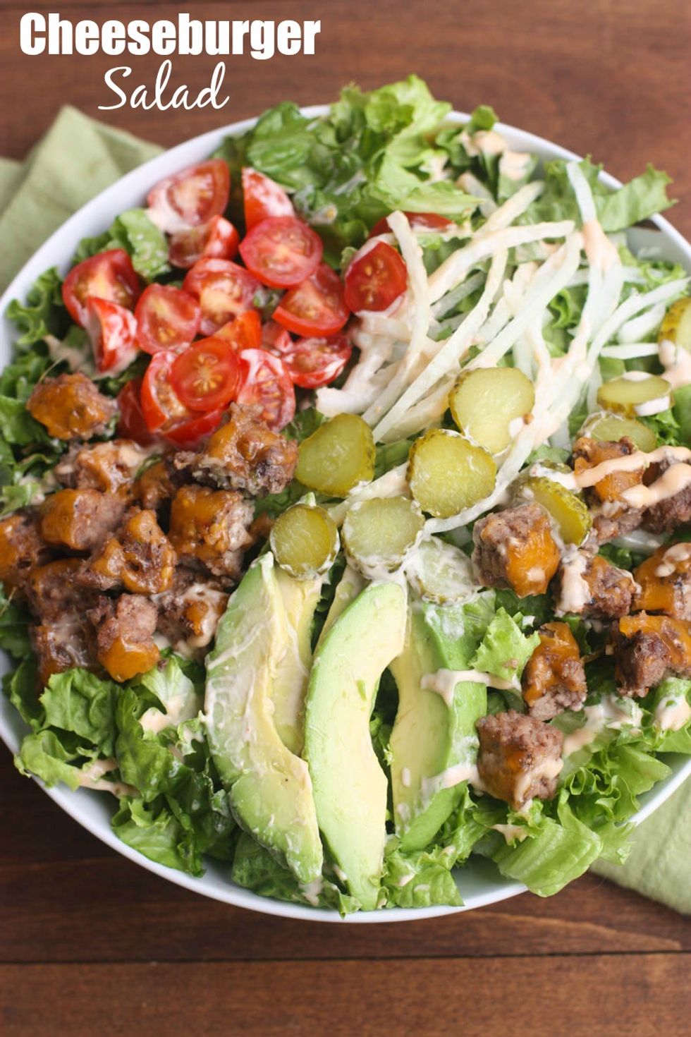 My family loves this Cheeseburger Salad. All of our favorite burger toppings layered onto a delicious, hearty salad.