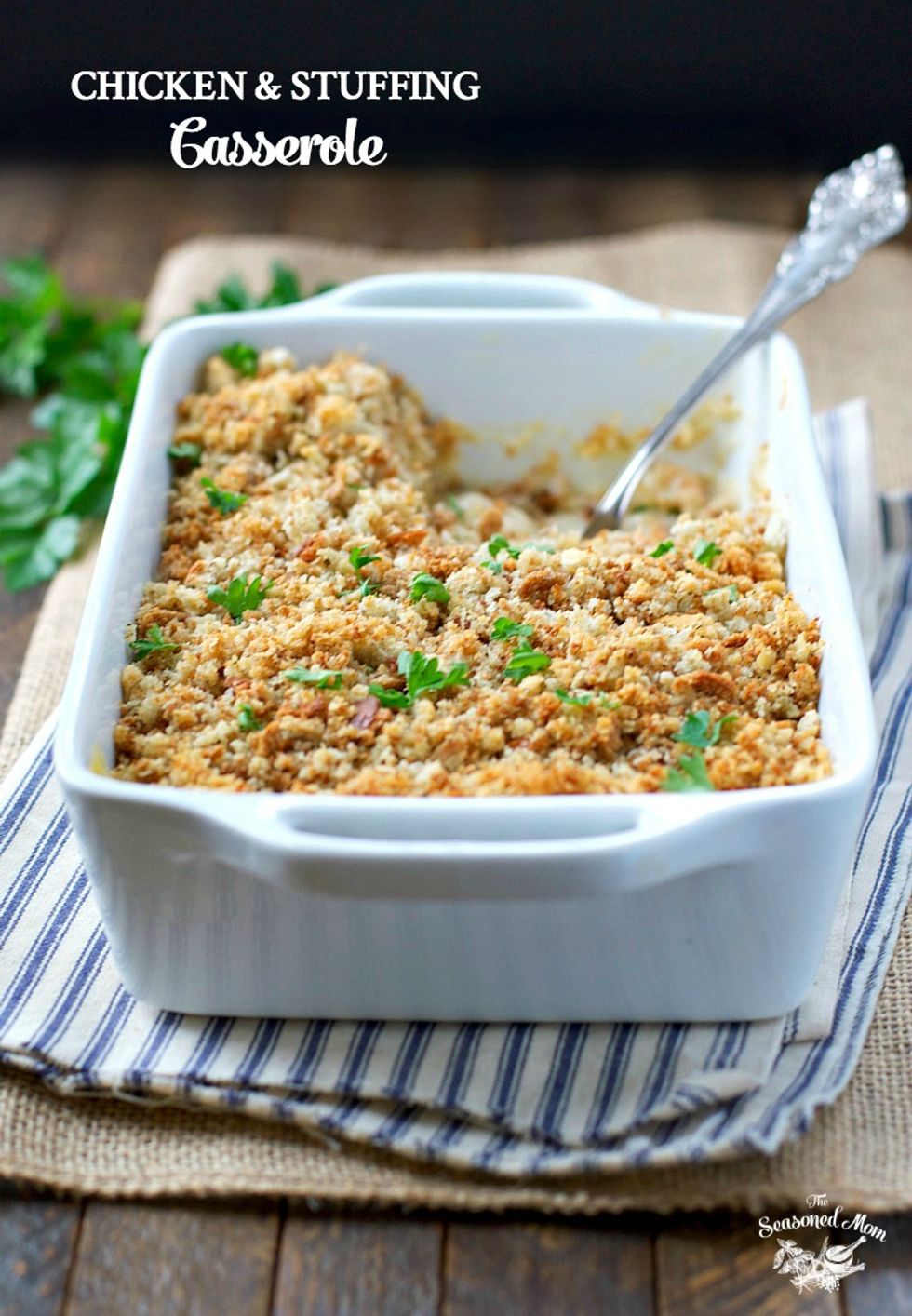 Chicken and Stuffing Casserole is old-fashioned, cold-weather comfort food! The easy dinner recipe only requires about 15 minutes of prep, can be assembled in advance, and appeals to even the pickiest little eaters. The simple combination of shredded rotisserie chicken, cream of mushroom and cream of chicken soup, and Pepperidge Farm or Stove Top stuffing is delicious alongside broccoli and cheese, cranberry sauce, and pumpkin muffins!