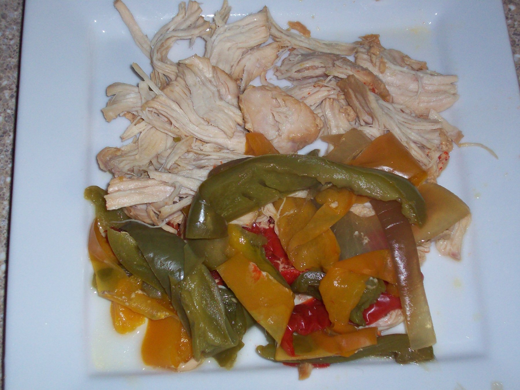 1. In the Ninja, pour a little oil & then place 4 or 5 frozen chicken breasts on the bottom. Sprinkle the chicken with the taco seasoning. Layer the peppers & onion. Cover & cook on crockpot low for 5 hours. Shred everything up and mix together. Serve with tortillas and all of your favorite toppings.