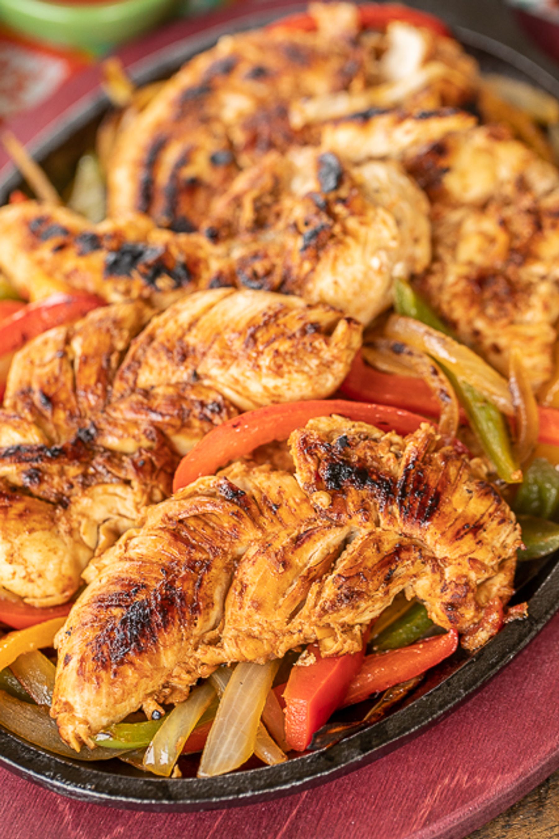 Easy Chicken Fajitas - SO much better than the Mexican restaurant and only 5 ingredients! We make these every week - great meal prep recipe! Chicken, Italian dressing, diced tomatoes and green chiles, taco seasoning and lime. Let the chicken marinate overnight and quickly cook in the skillet. Add onions and peppers for an authentic Mexican restaurant taste. SO easy and SO good! #mexican #chicken #chickenfajitas #mealprep