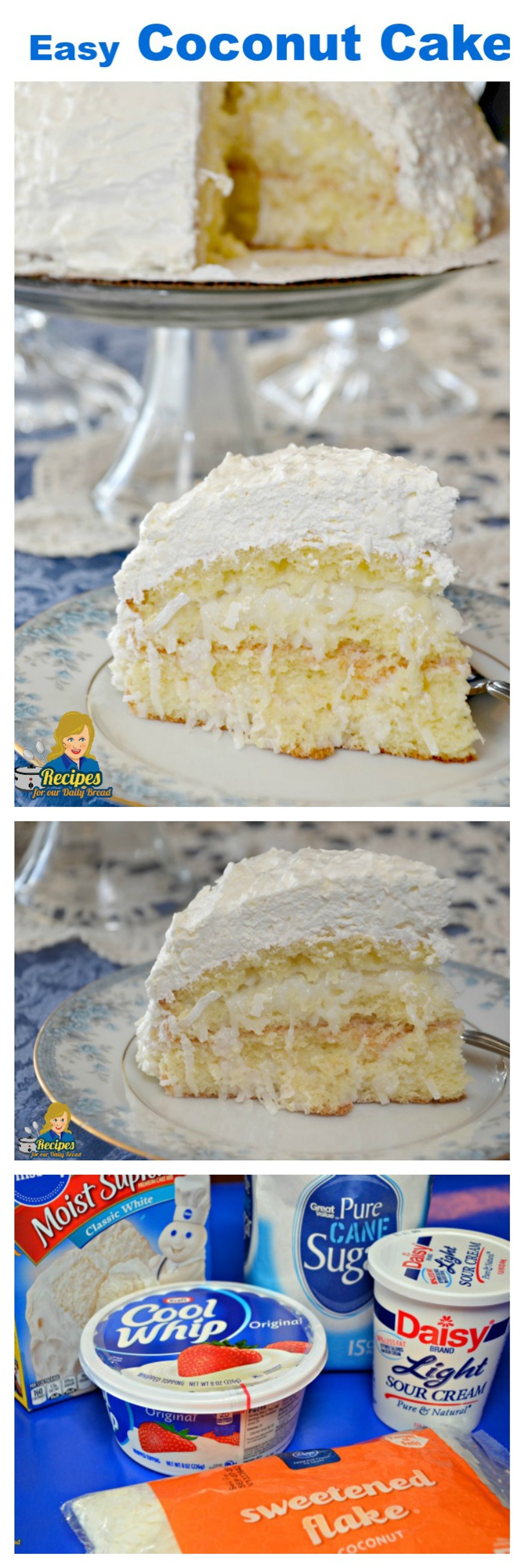 Easy Coconut Cake is made using 5 simple ingredients including cake mix, coconut, sugar, sour cream and whipped topping. It is so simple to make and super delicious. You will not be disappointed in this truly easy and super delicious.