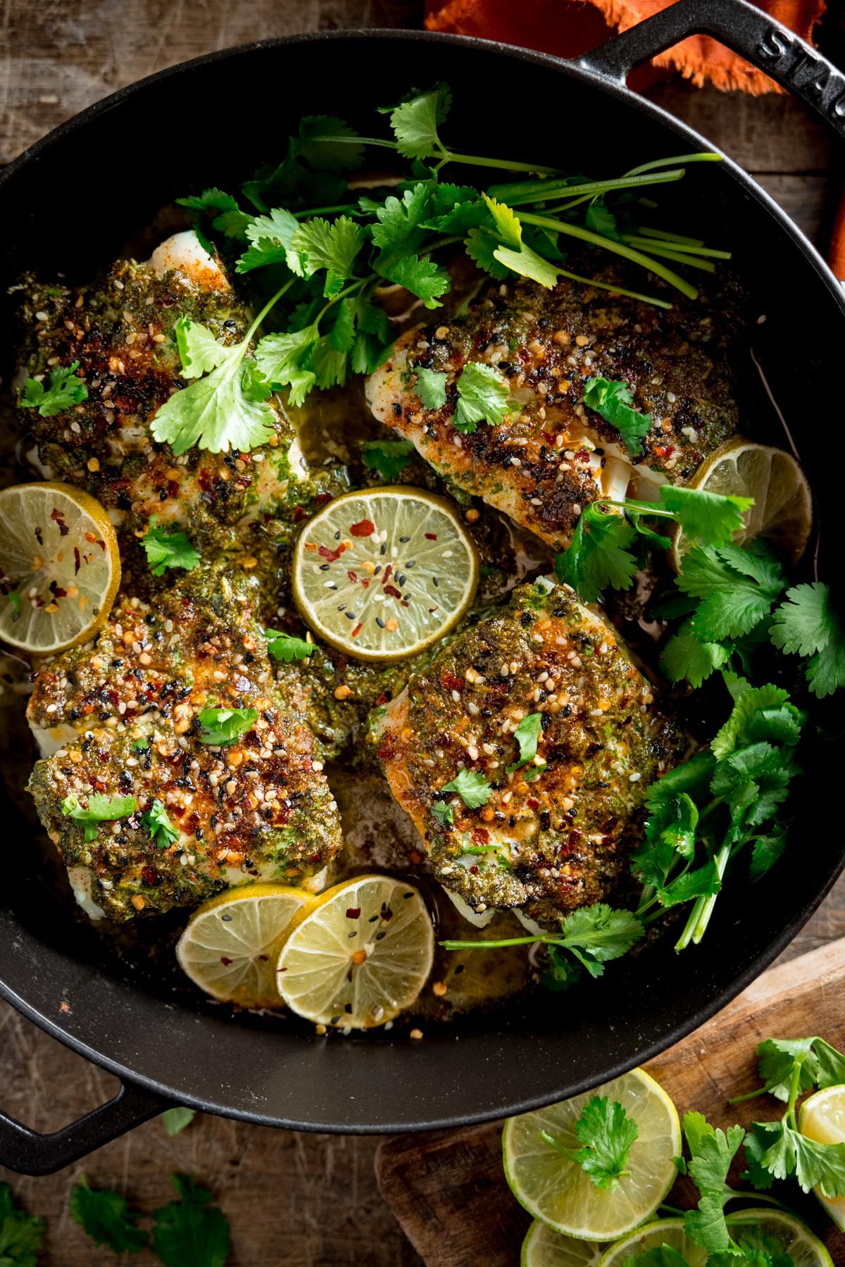 This easy cod bake is a dinner, bursting with flavours of coriander, lime, garlic and chilli. All made in one pan in less than 30 minutes!