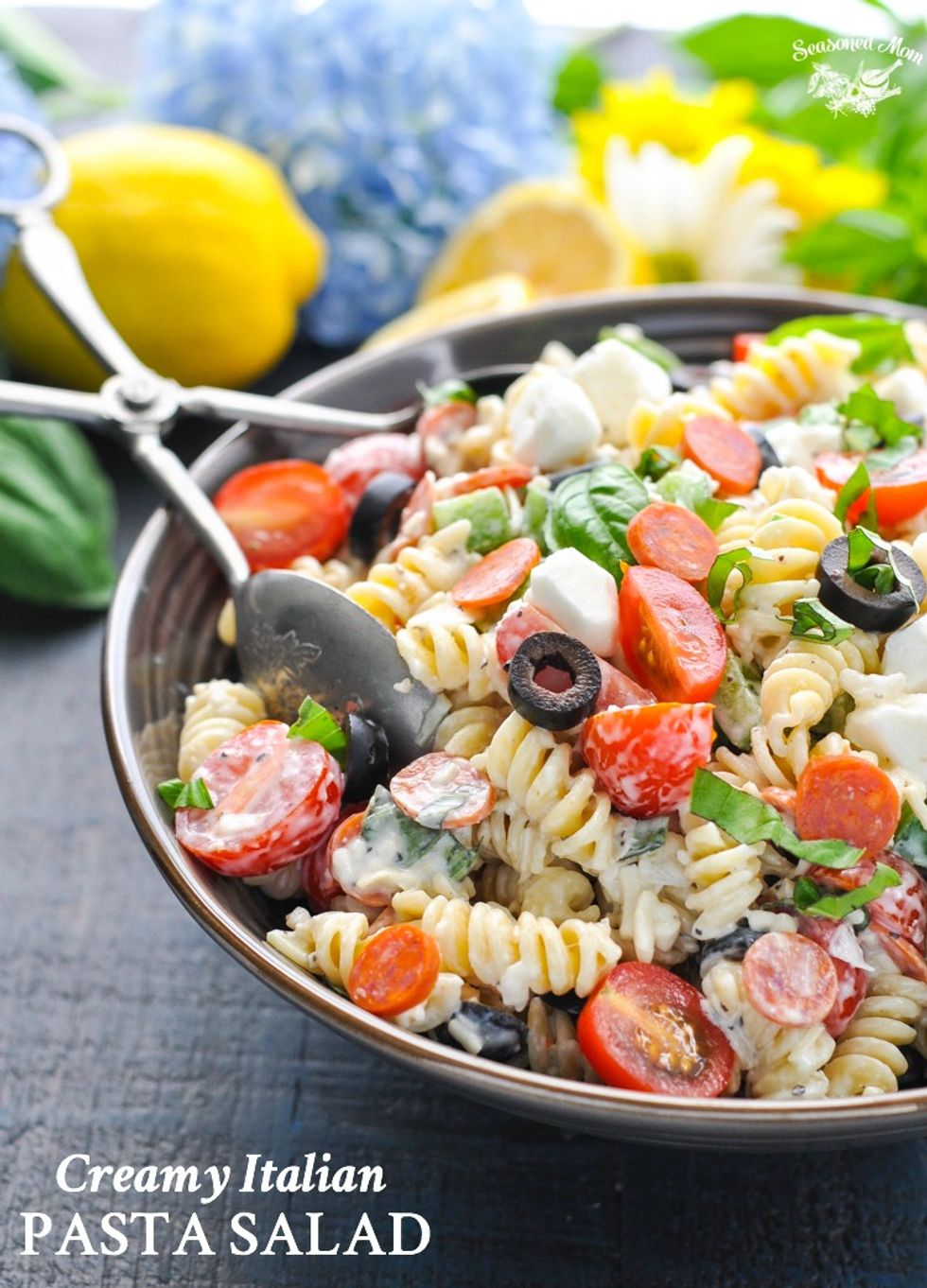 Full of fresh, flavorful ingredients, this Creamy Pasta Salad recipe is a quick and easy dish for picnics, potlucks, or light and satisfying dinners. The Italian-inspired ingredients like pepperoni, mozzarella, tomatoes, bell pepper, olives, and fresh herbs are tossed in a Creamy Italian dressing for a crowd-pleasing meal that makes summer entertaining easy!