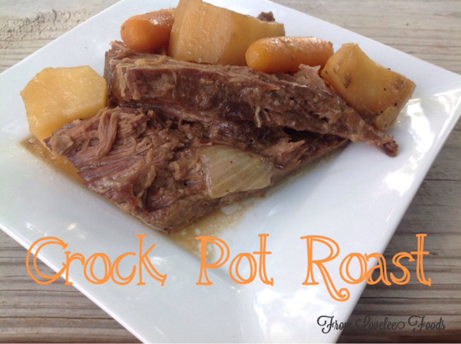Chuck Roast, Cream of Mushroom soup, dry onion mix soup, baby carrots, onions, potatoes