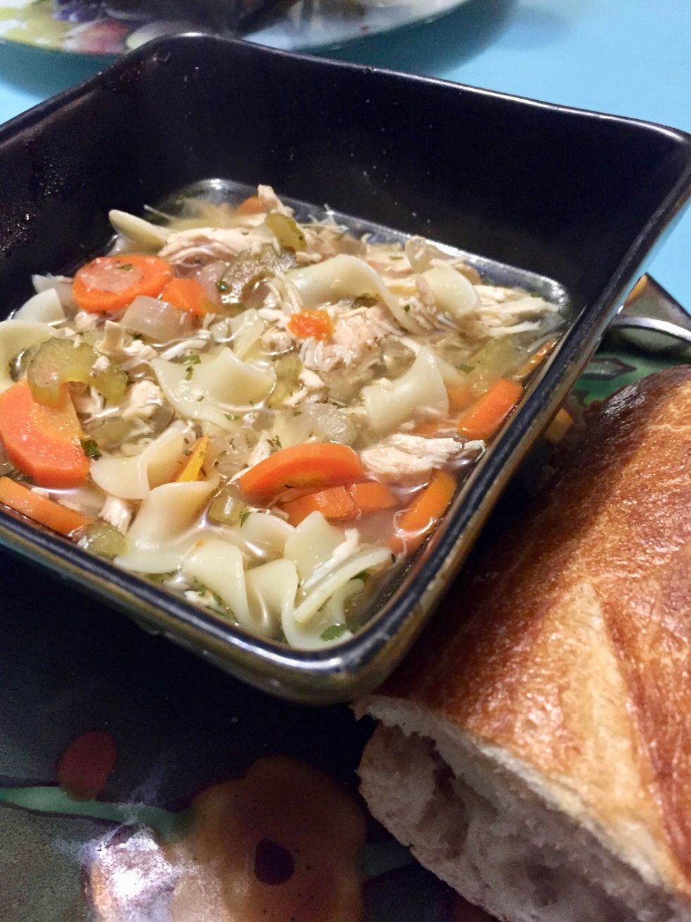 To a slow cooker, add chicken (un-cut), diced carrots, onion, celery, and garlic. Drizzle olive oil over top then add in chicken broth, water, thyme, rosemary, celery seed, bay leaves and season with salt...
