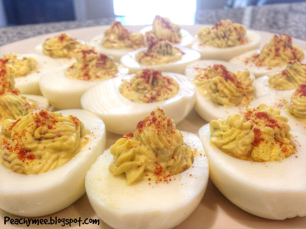 Peel shells off the hard boiled eggs and slice half lengthwise.