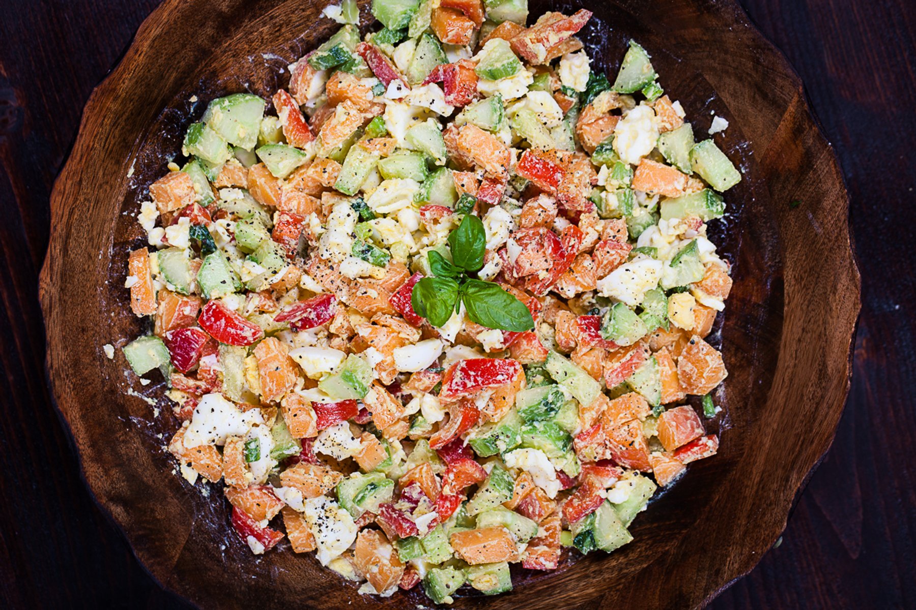 This crunchy salad has a hearty and slightly sweet taste. The lovely apricots pair well with fresh cucumbers, red bell peppers and the wonderful aroma of fresh basil and scapes. The salad becomes creamy when combined with mashed boiled eggs and extra virgin olive oil. This quick recipe is always a favorite as a light lunch, picnic idea or great side dish for a garden party or barbecue.