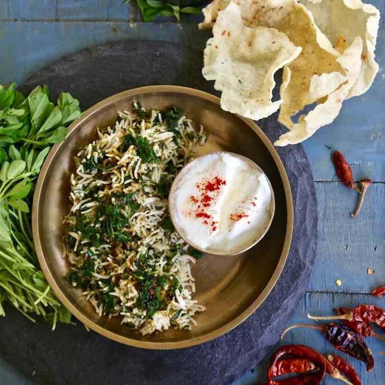 With the fresh, green bitterness of fenugreek balanced by the nuttiness of roasted dals, chilies and coriander seed, and the fragrant aroma of basmati, Fenugreek Rice is a healthy meal-in-one needing accompaniments of only yoghurt, papad and pickles.