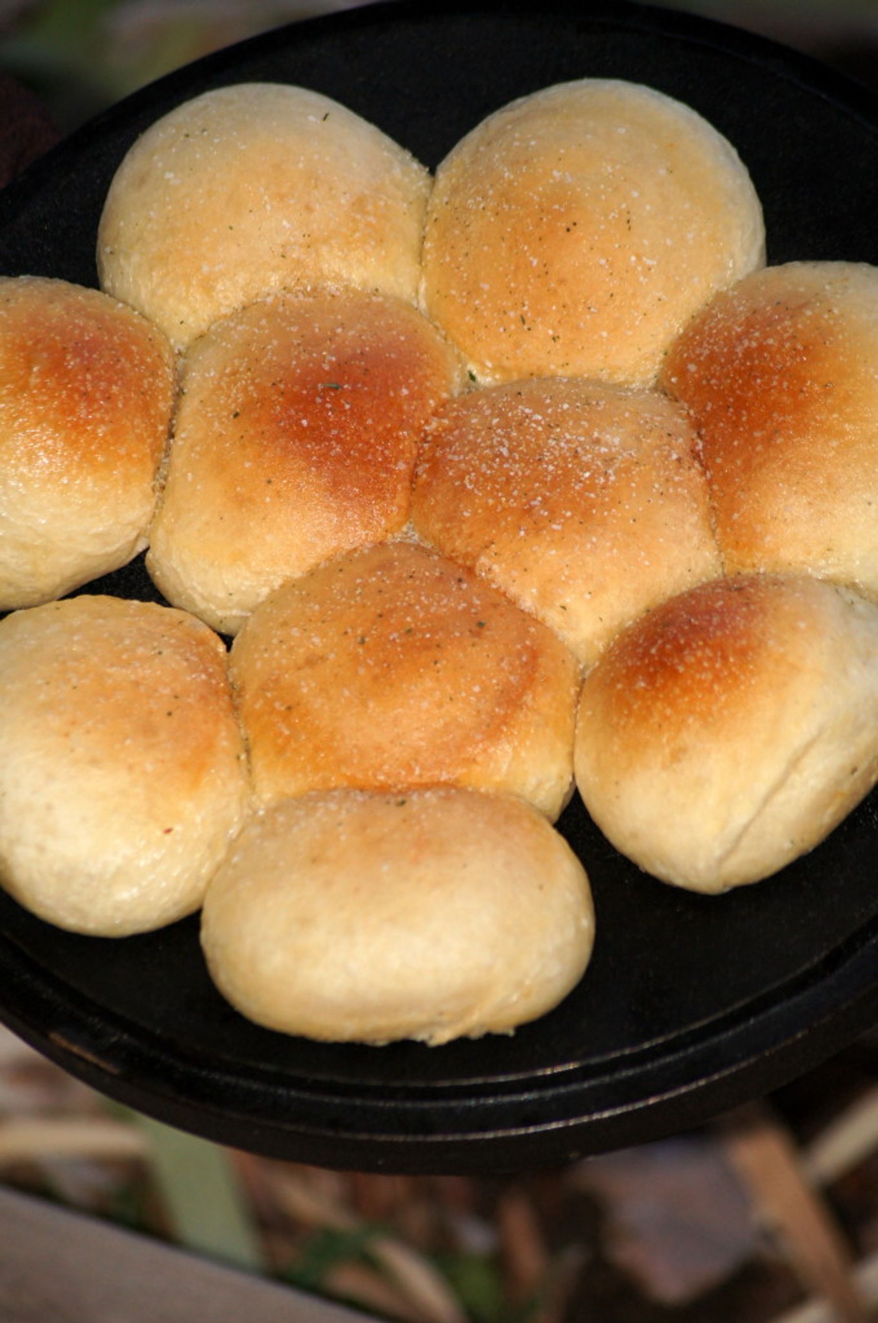 Spray or line a 12\\\" Dutch oven. Place frozen rolls in the oven with seven around the edge and three in the middle. Allow to rise until doubled, 3 - 5 hours depending on the temperature outside. Cook at...