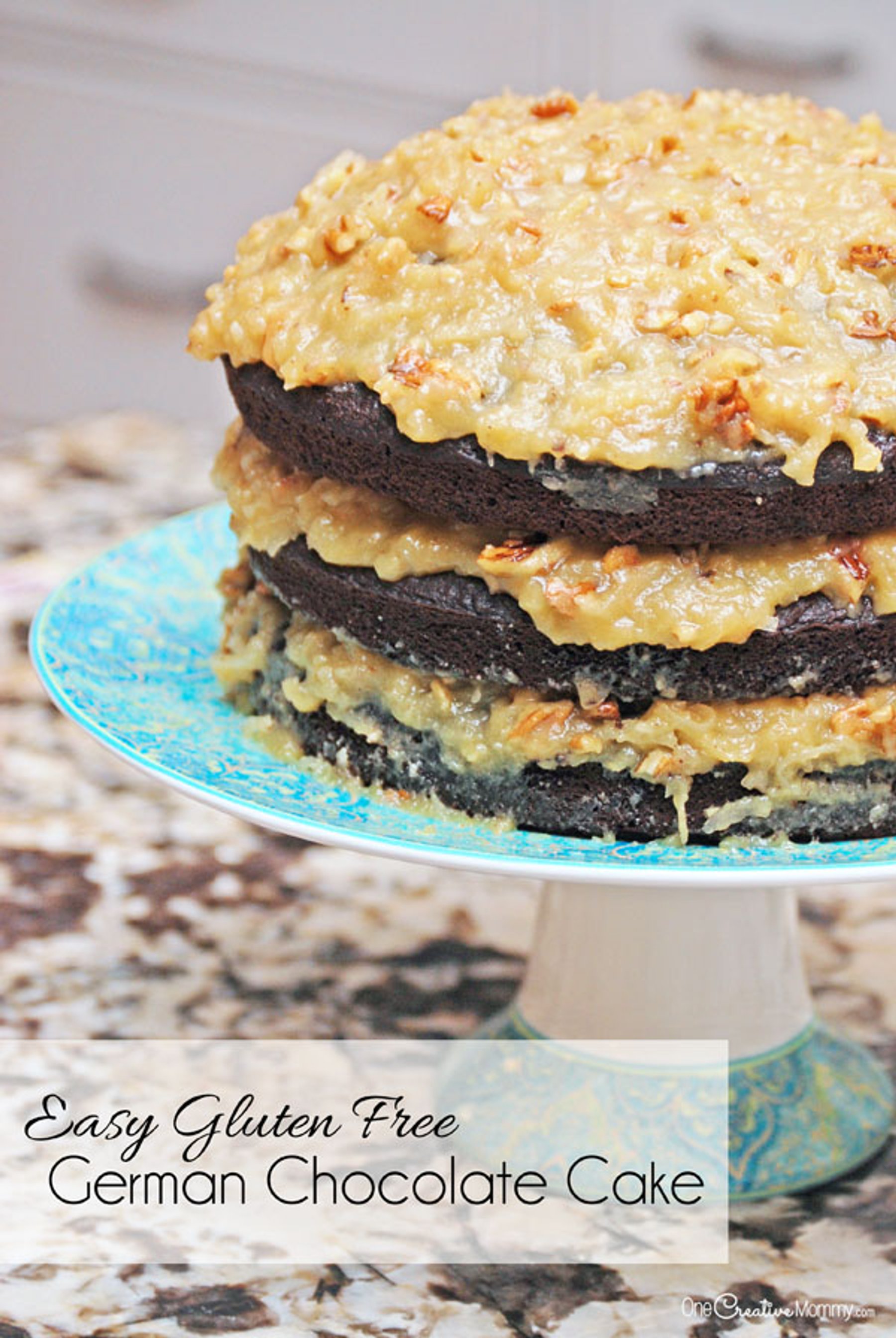 Start with a Gluten Free cake mix to make this super easy and delicious German Chocolate Cake . Recipe for Coconut Pecan Frosting also included.