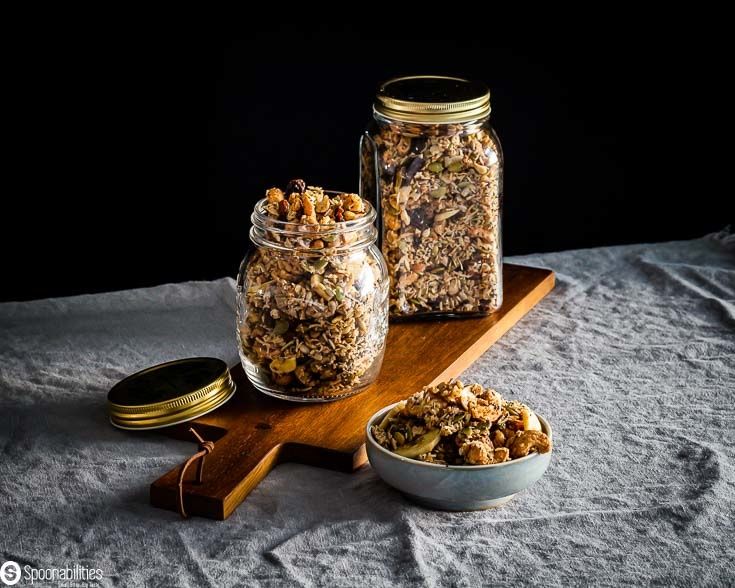 This easy grain-free granola recipe has essential pantry staple ingredients like nuts, coconut flakes, seeds, Greek extra virgin olive oil, and it's naturally sweetened with maple syrup. This granola is Paleo, vegan, gluten-free, grain-free, and refined sugar-free. It is very versatile because you can add or omit any of the ingredients or adjust to what you currently have in your pantry. The idea is that you don't have to leave the house to get anything. Also, you don't need to measure ingredients precisely. Add the amount that you have or wish to use. And you have the perfect grain-free granola!