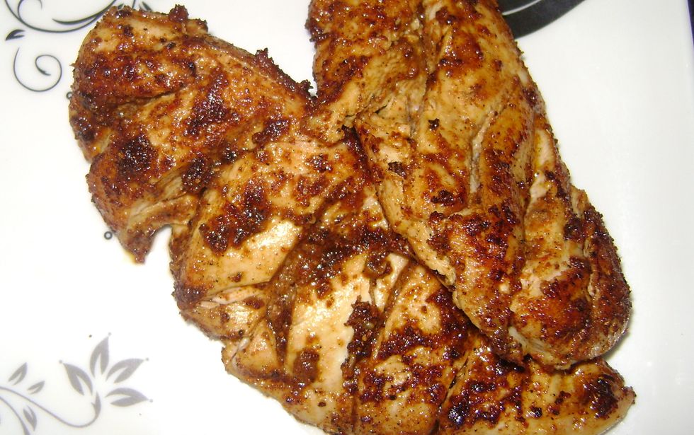 Make 2 or 3 cuts on the chicken breast both the sides. Mix all ingredients (except oil) and rub on chicken properly. Heat olive oil in a grill pan and cook the chicken 10 to 15 minutes per side, till golden brown.