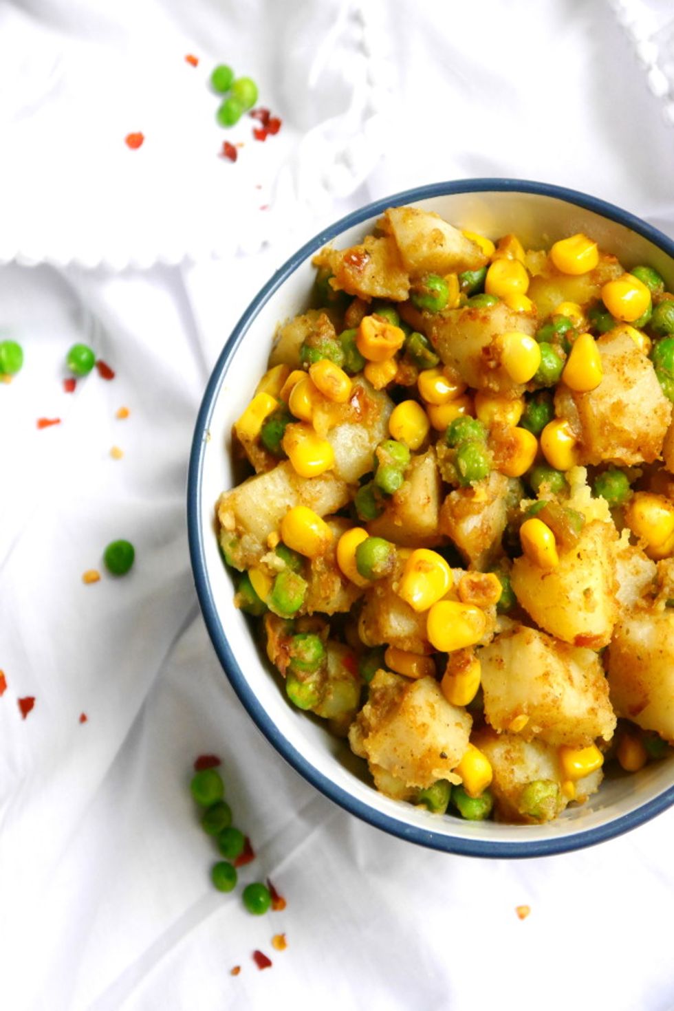 Very easy and very quick Potatoes with corn, peas and Indian seasonings. You have yourself a taste of Indian food on your kitchen table just in few minutes