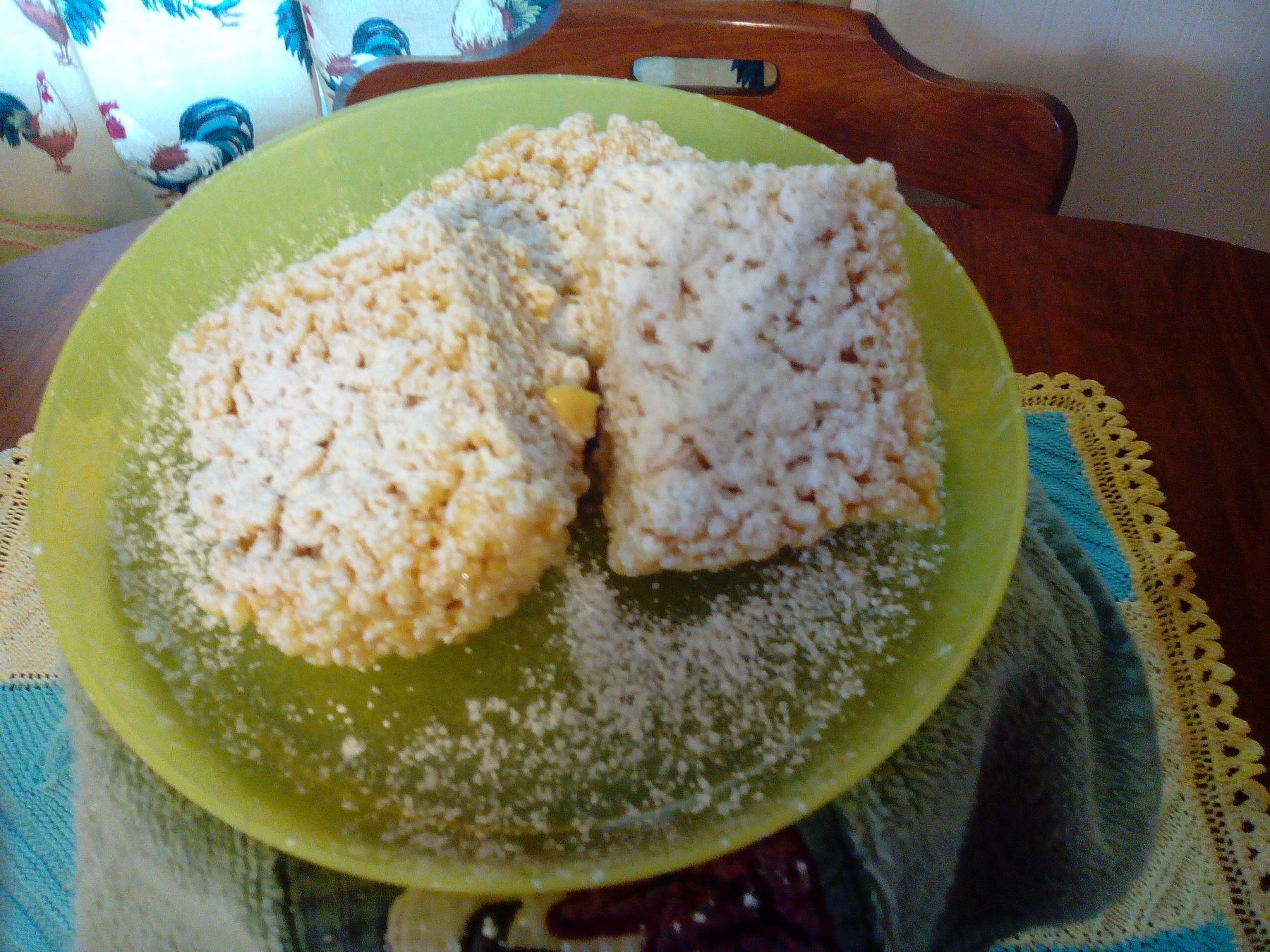mix marshmallows and margarine heat tell marshmallows are melted add putting and lemon juice stir in rice krispies press into an 8 inch pan sprinkle with powdered sugar