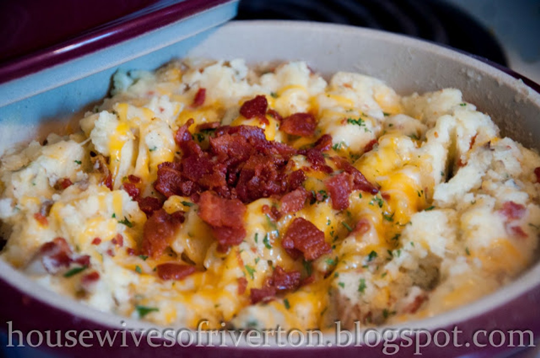 Delicious mashed potatoes loaded with bacon, cream cheese and cheese!