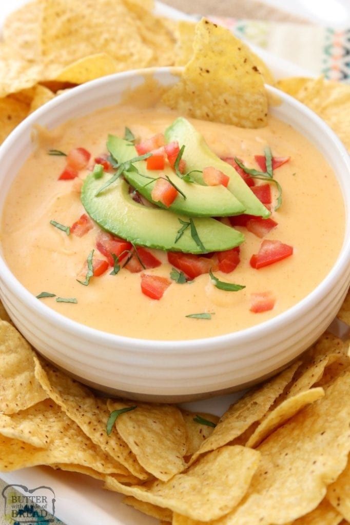 Easy Nacho Cheese sauce recipe with only 4 ingredients and is made in minutes! Smooth, creamy with great nacho cheese flavor, this recipe is perfect for parties, busy weeknight dinners and game day food!