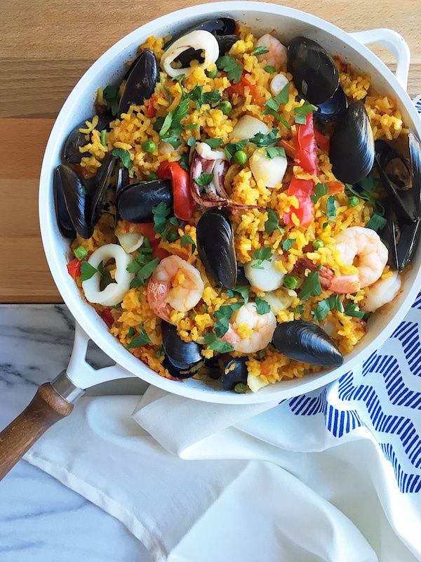 10 minutes of prep, lots of flavor and a complete healthy meal in one skillet! This simple Seafood Paella is the perfect weeknight meal (and goes great a glass of white wine).