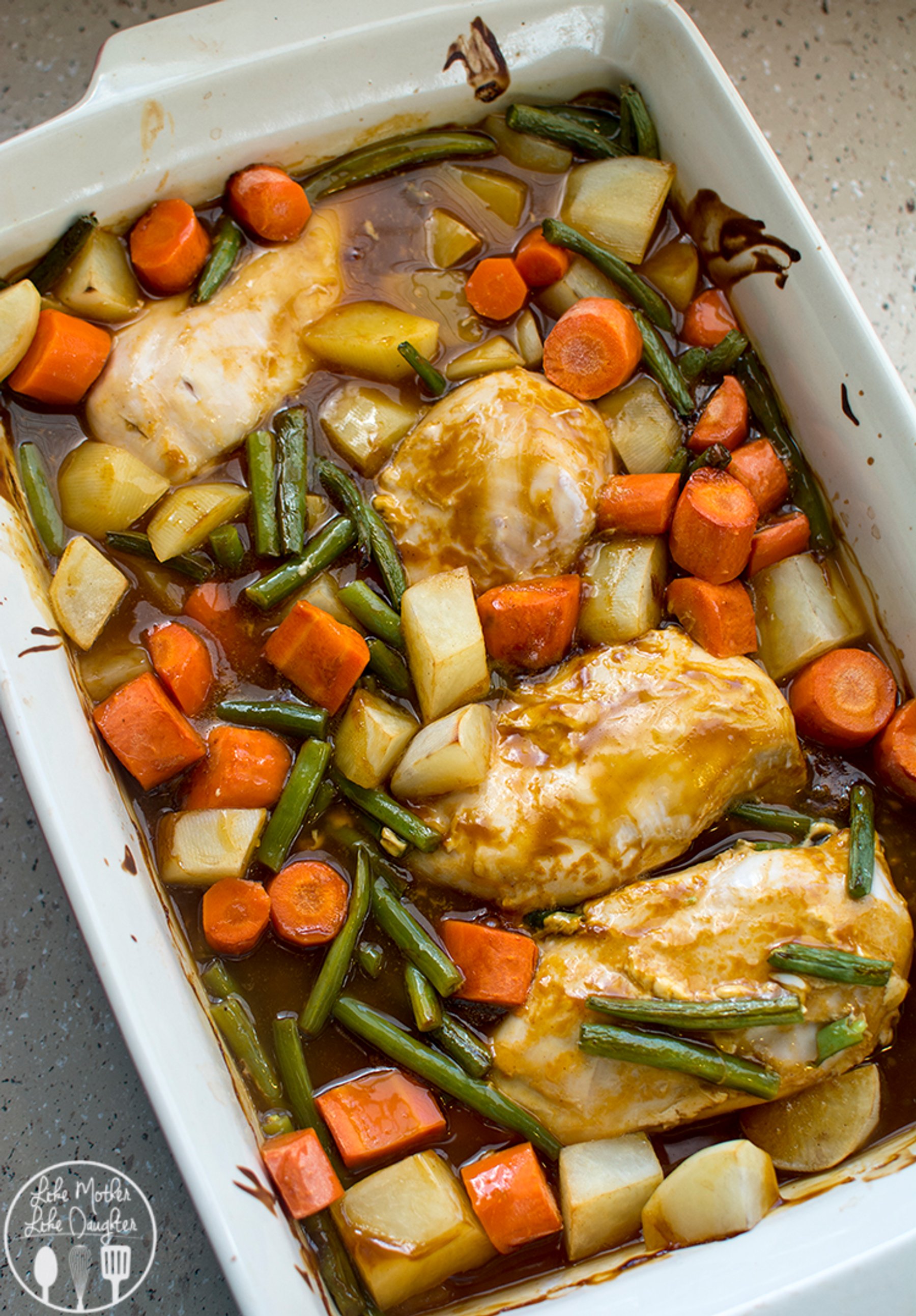 Place your chicken into a 9x13 inch baking pan and spread your vegetables all around.