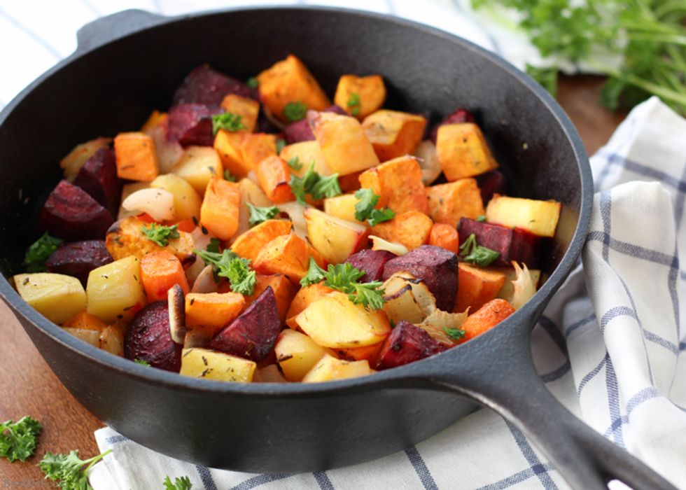 Preheat oven to 425 degrees F. Peel vegetables and cut into 1-1½-inch pieces. Lightly grease a large cast iron skillet or baking sheet with olive oil. Add all vegetables to the pan and top with olive oil,...