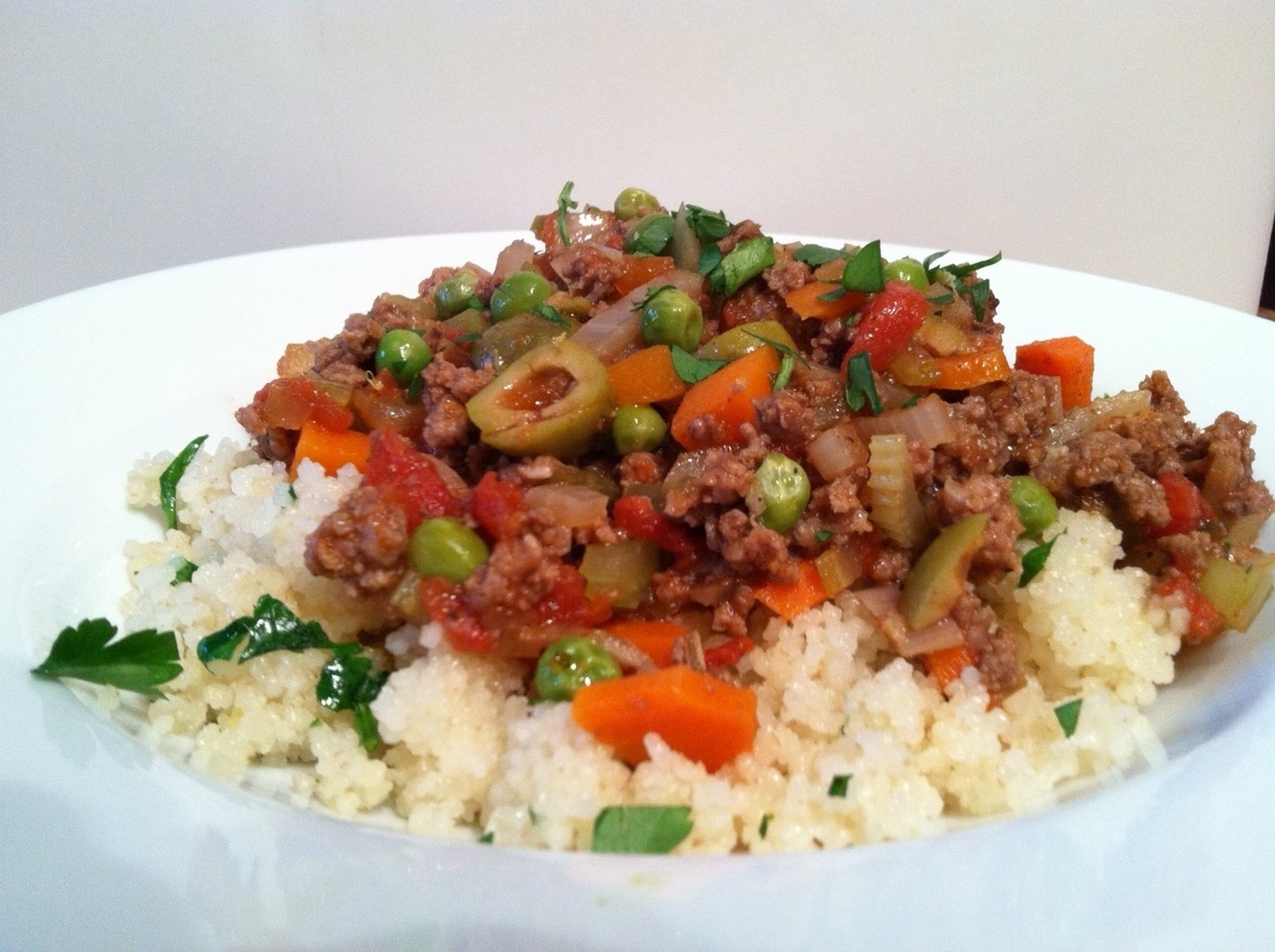 This dish is a family favorite. It's origins are Latin and there are so many variations of it. I have made it with ground turkey and pork as well and it's delicious. This could easily become a Vegetarian dish by subbing TVP or crumbled tofu (I haven't tried that version yet...) and it's naturally Gluten free. It can be served over rice, but today I made a Lemon Parsley Couscous and it was a beautiful compliment to this flavorful dish. This can also be used as a filling for
