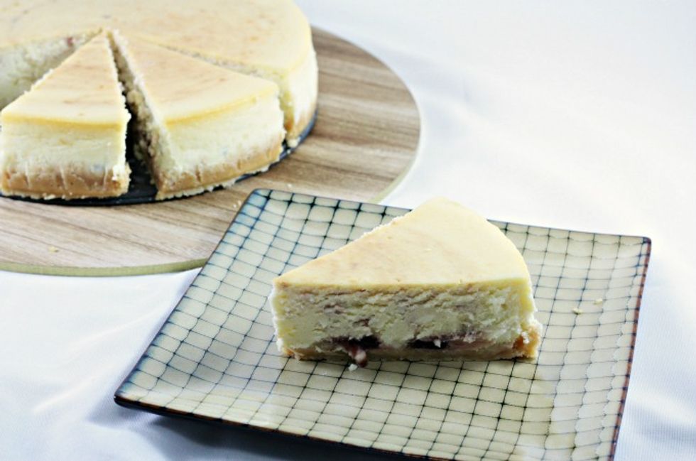 Raspberry Cheesecake only requires 8 ingredients and features a shortbread cookie crumb crust and a creamy center with sweet raspberry preserves.