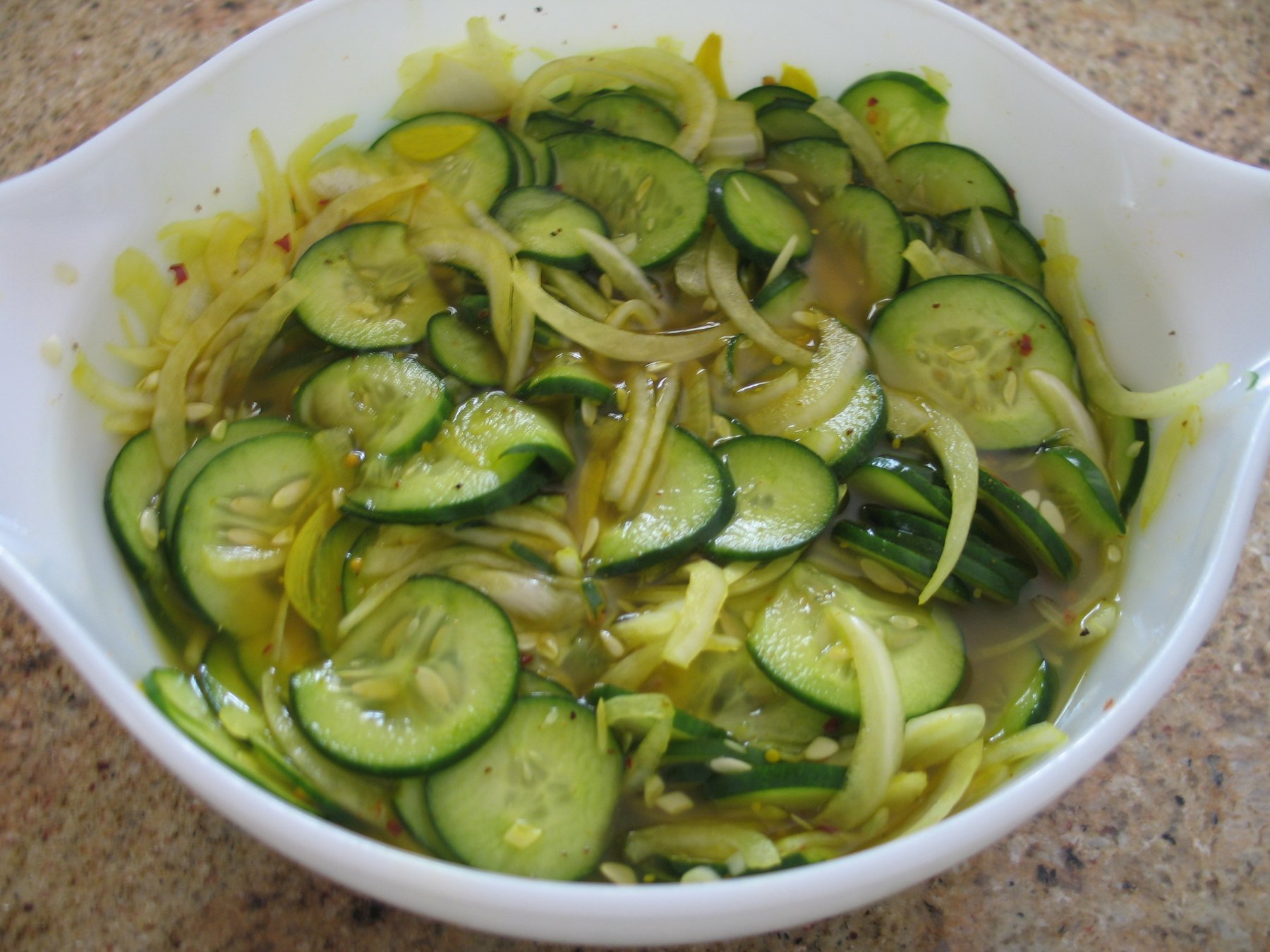 Sliced the cucumbers and onions in my food processor - fast and easy!