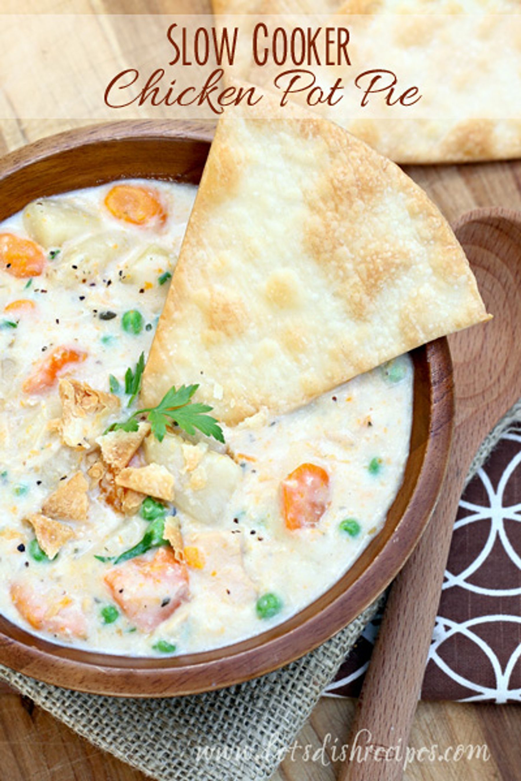 Chicken pot pie in the slow cooker! Topped with baked pie crust wedges.