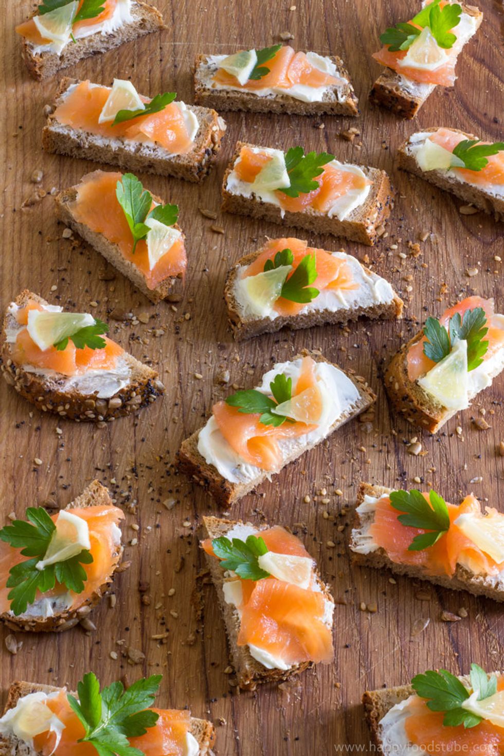 Smoked salmon bites. Slices of bread topped with Philadelphia cheese, salmon, lemon and garnished with parsley. Easy and fast appetizer for any party!