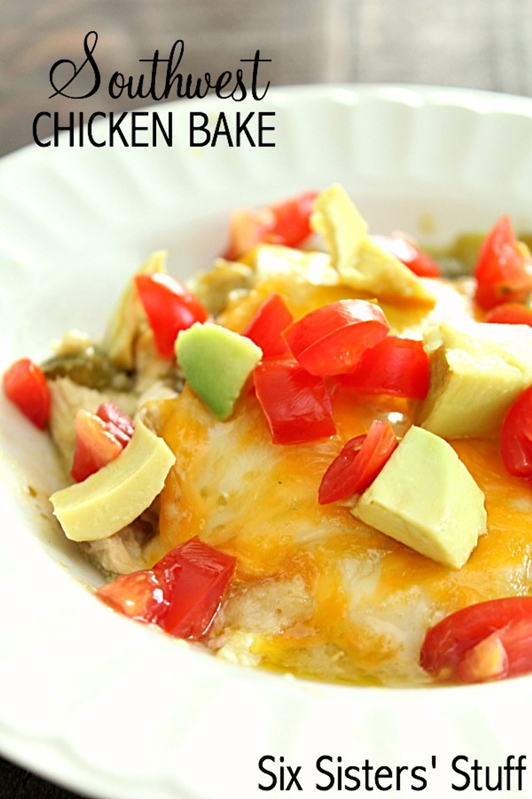 In the prepared pan, layer half of the chicken, enchilada sauce, sour cream, tortillas, chilis, tomatoes and cheese. Repeat...