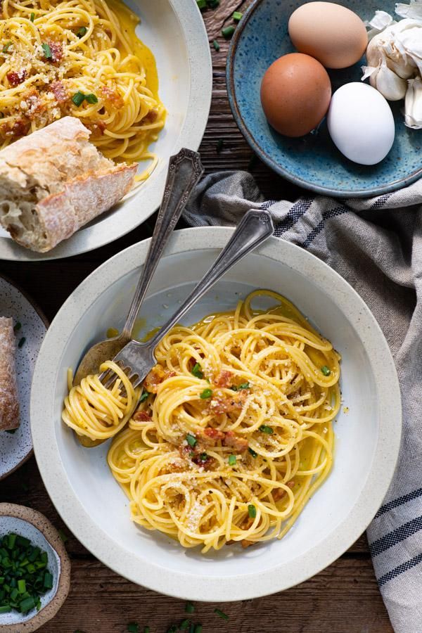 This easy spaghetti carbonara recipe is a simple dinner that comes together in about 20 minutes. The creamy pasta with bacon doesn't even need cream, as the velvety texture comes from a quick sauce made with eggs, garlic and Parmesan. Serve a bowl of the best spaghetti carbonara with a Caesar salad and a side of garlic bread for the ultimate weeknight dinner!