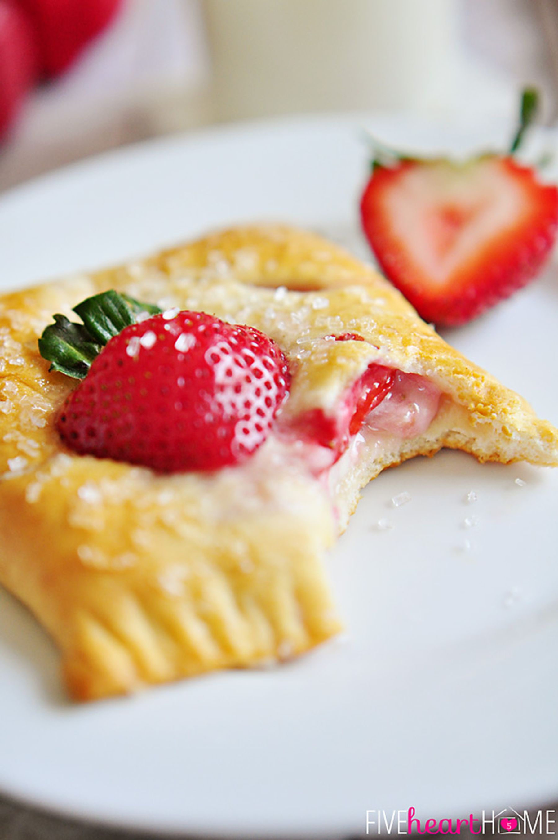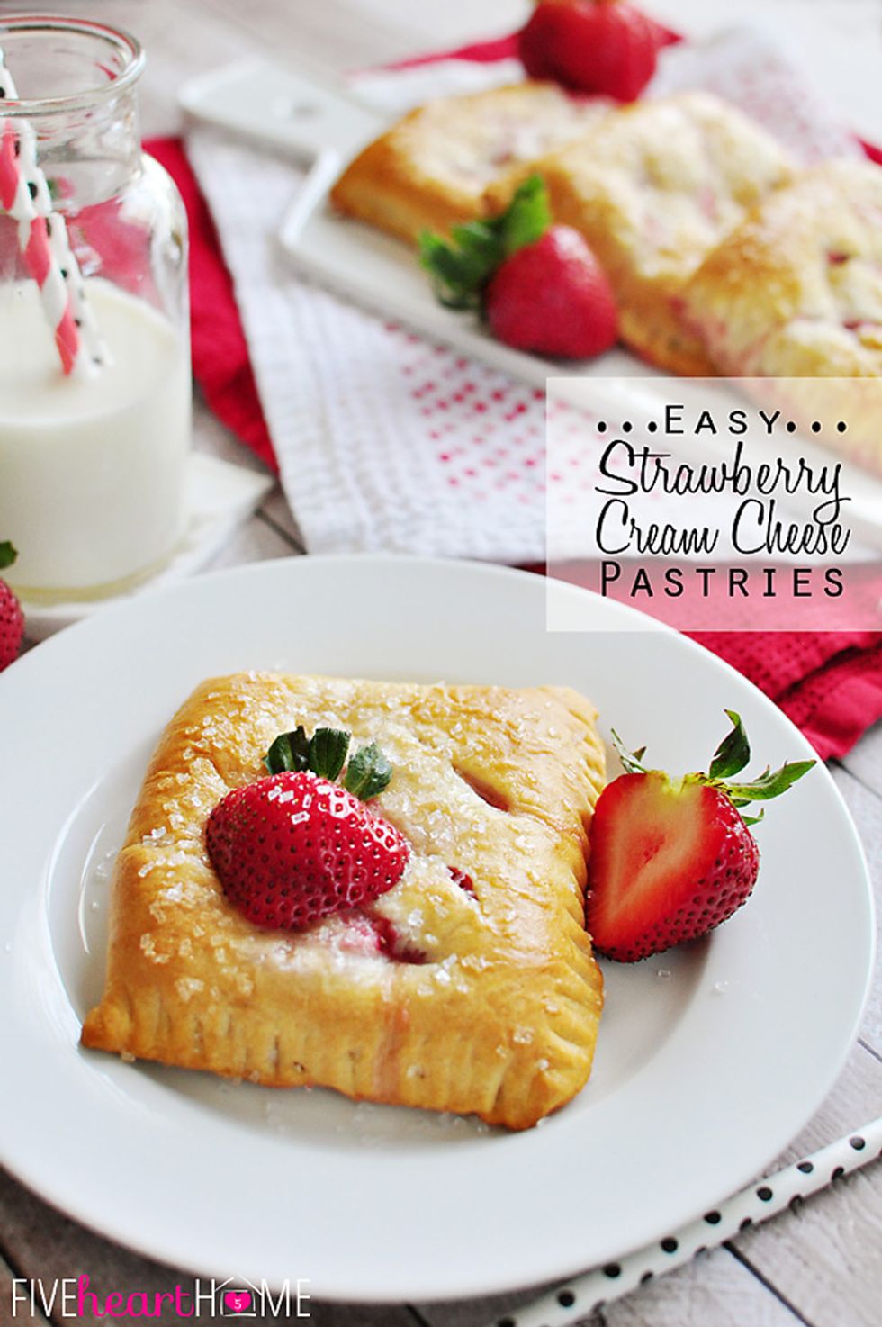 Flaky crescent roll dough is wrapped around a filling of cream cheese and fresh sliced strawberries in these quick and easy breakfast pastries.