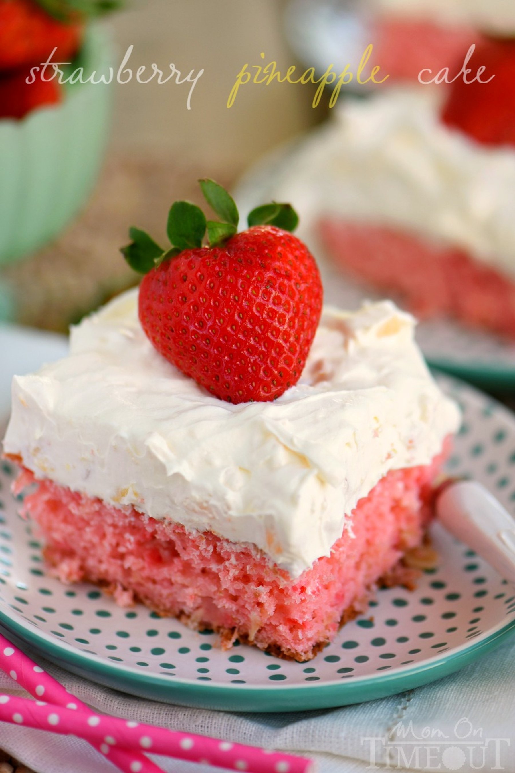 This Easy Strawberry Pineapple Cake is topped with the creamiest pineapple fluff frosting! Perfect for spring and summer entertaining!