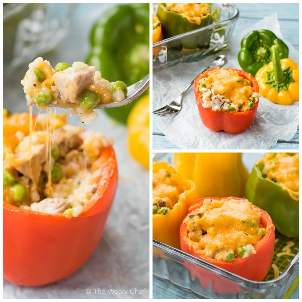 Preheat oven to 375 degrees F. Shred or chop the cooked pork into bite sized pieces. You will need approximately half a roast for this recipe. Carefully cut off the top of each pepper. Use your fingers to...