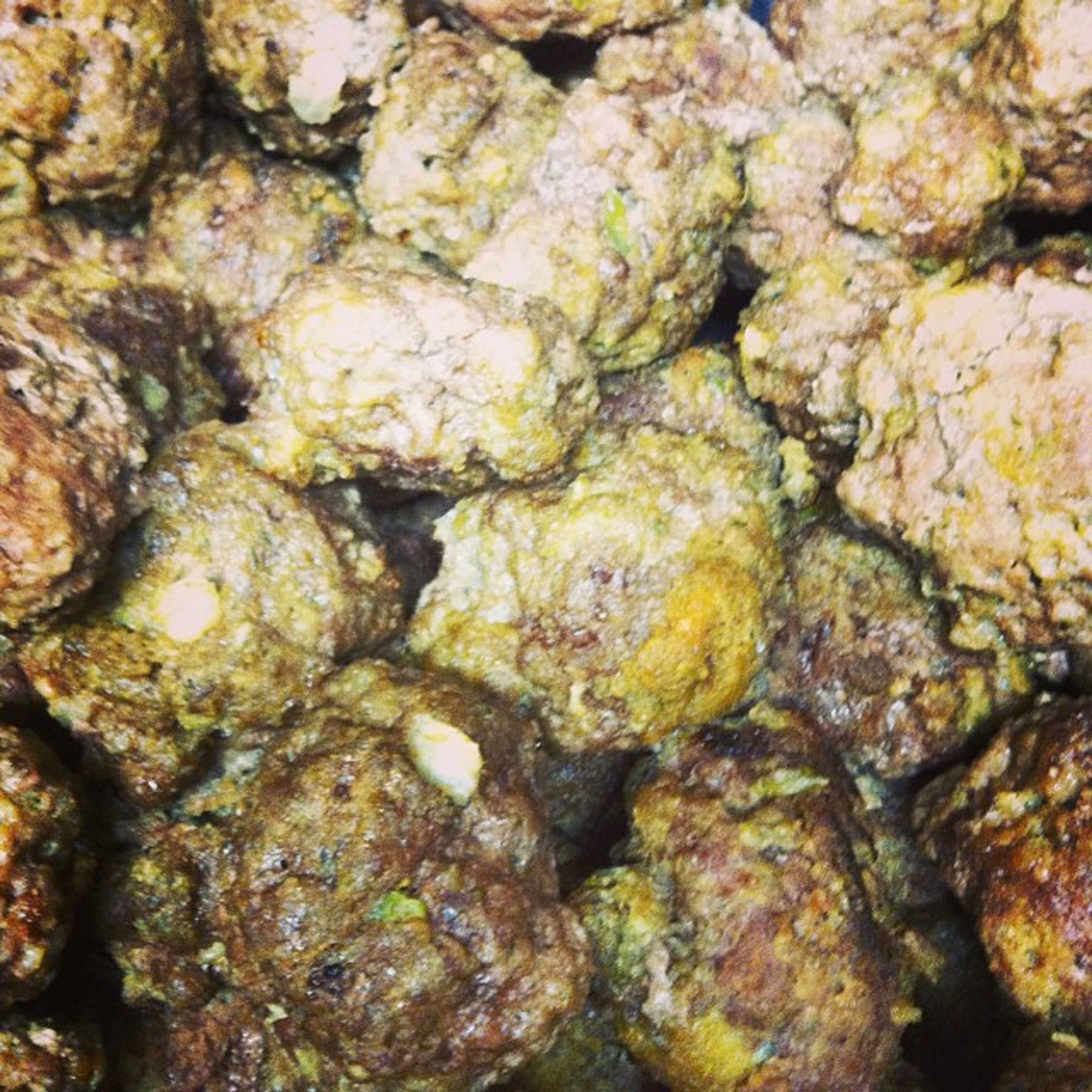 Place all ingredients in food processor except for ground beef and bread crumbs and puree. Place ground beef, bread crumbs, and mixture in large mixing bowl and kneed with your hands until well mixed. Roll...