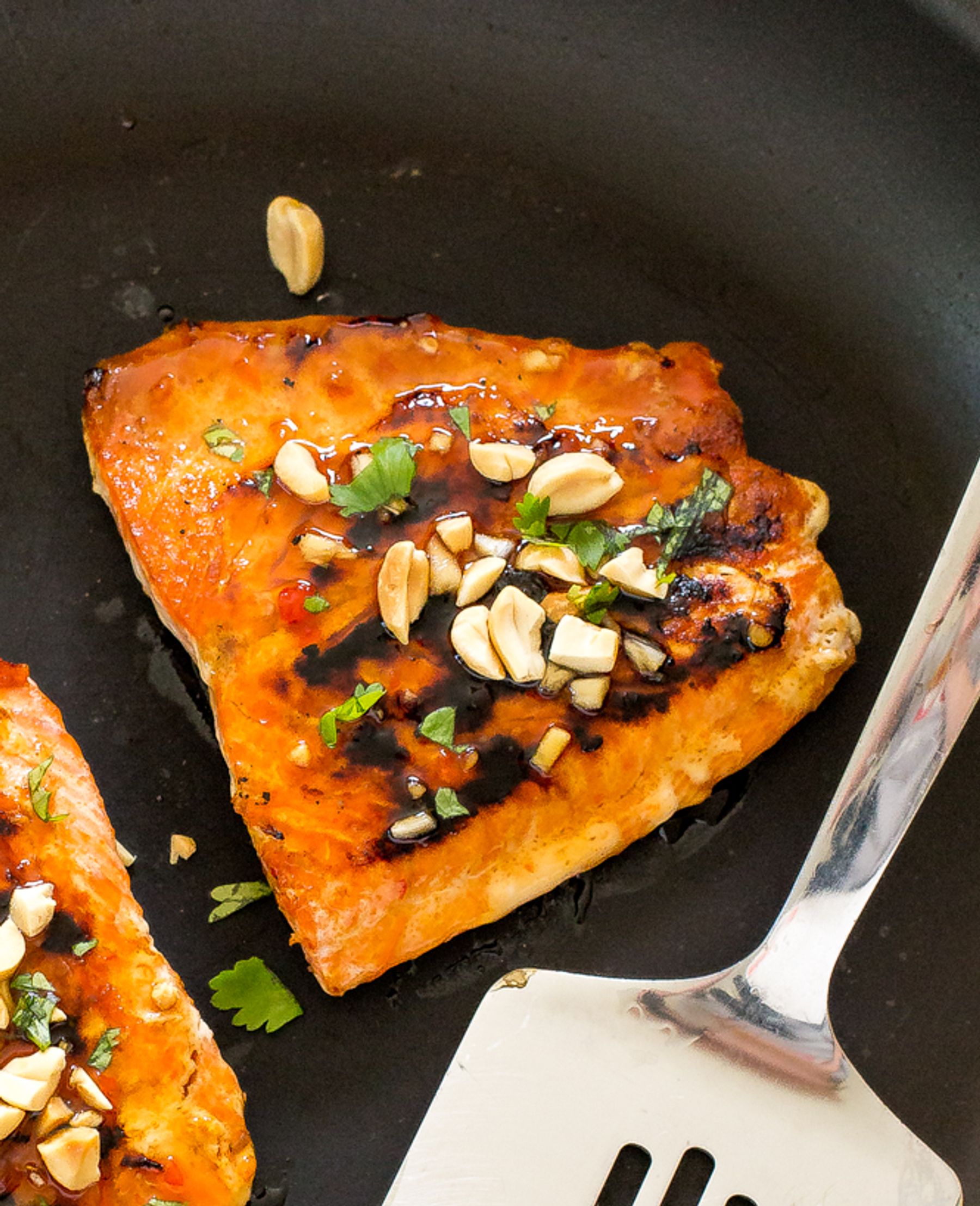 Super Easy Thai Salmon. Pan fried salmon topped with a sweet Thai chili sauce. Ready in less than 20 minutes!