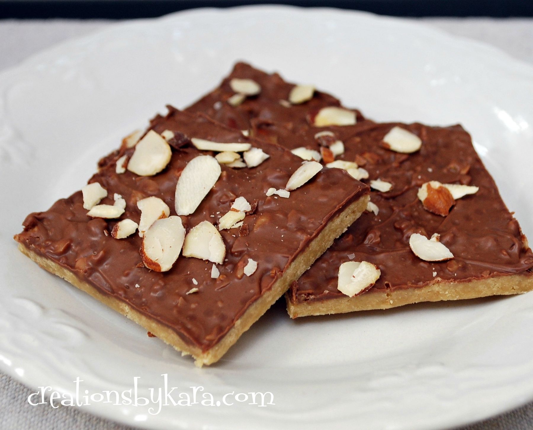 Cream the butter and brown sugar. Beat in the egg yolk and vanilla. Stir in the flour and salt. Press into a greased 15×10" jelly roll pan. Bake at 350 for about 15 minutes. Sprinkle with chopped Symphony...