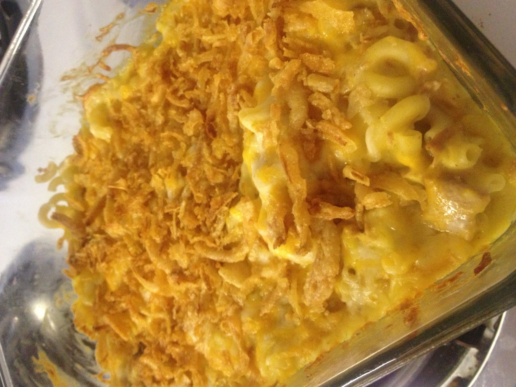 Bake for 25 minutes, or until cheese is bubbly. Sprinkle with fried onions and...