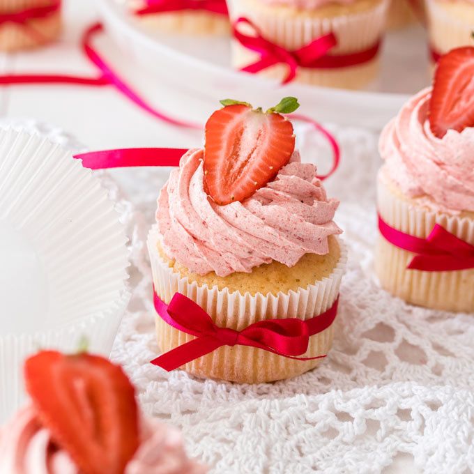 These easy Vanilla Cupcakes take no time at all to mix together. These moist and fluffy cupcakes are topped with a Strawberry Buttercream.