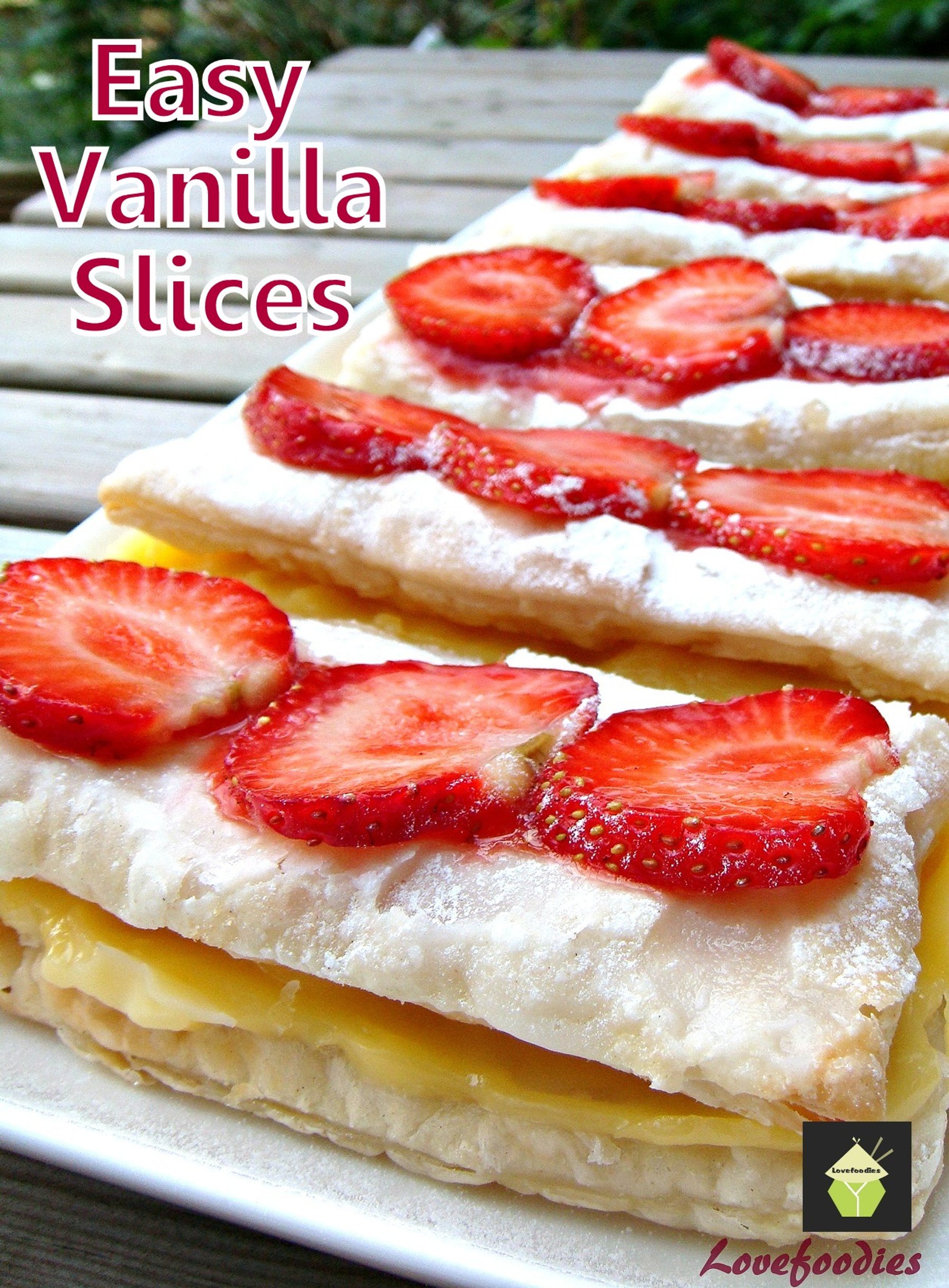 Easy Vanilla Slices! I have made this recipe easy, simply because it is so delicious, but if you were to make it the 'complicated' way, then I guess very few people would have the time or patience to make it! Vanilla Slices are also called Custard Slice, Mille - feuille, Napoleon, gosh, the list is endless. Typically, there should be three layers of puff pastry and then in between, there would be pastry cream, whipped cream, powdered sugar, or an icing glaze. It really does vary from