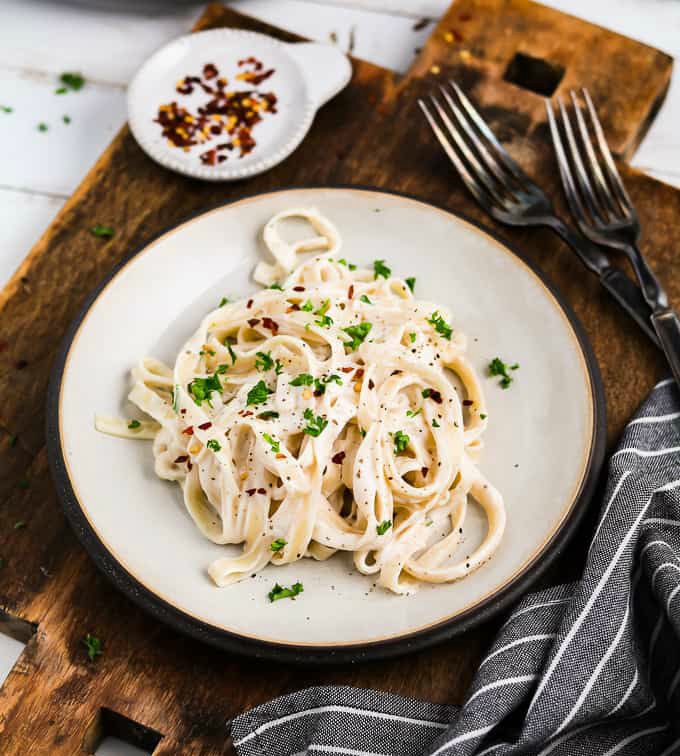 For a winning meal, serve this Easy Vegan Alfredo Sauce topped on freshly-cooked pasta. It'll be a surefire hit with a hungry crowd and will take you no time at all. Just 25 minutes! The base is made with cauliflower and cashews which creates and ultra-creamy and luxurious sauce.