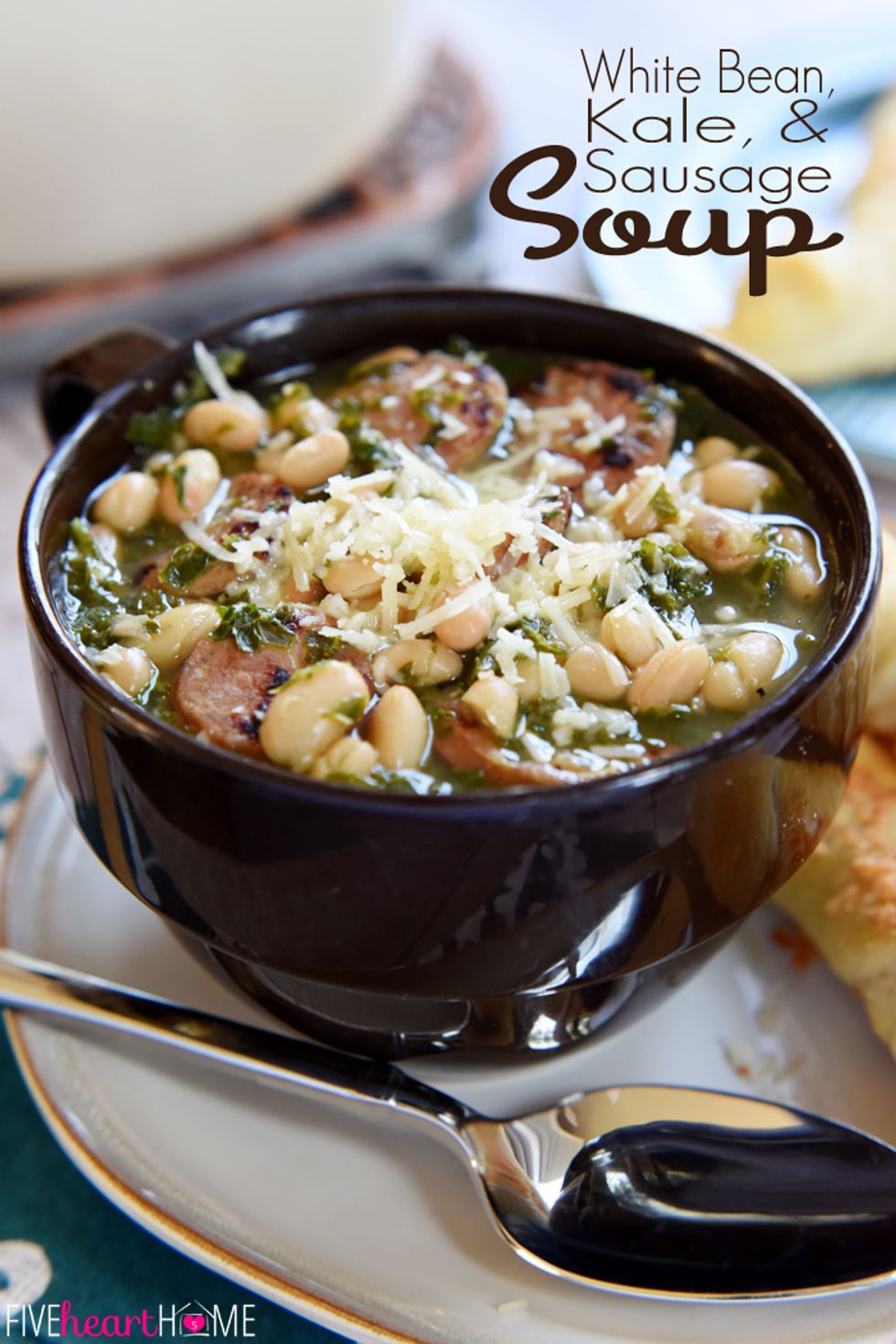 Hearty, healthy White Bean, Kale, & Sausage Soup is full of flavor, loaded with vitamins, and comes together in under 30 minutes!