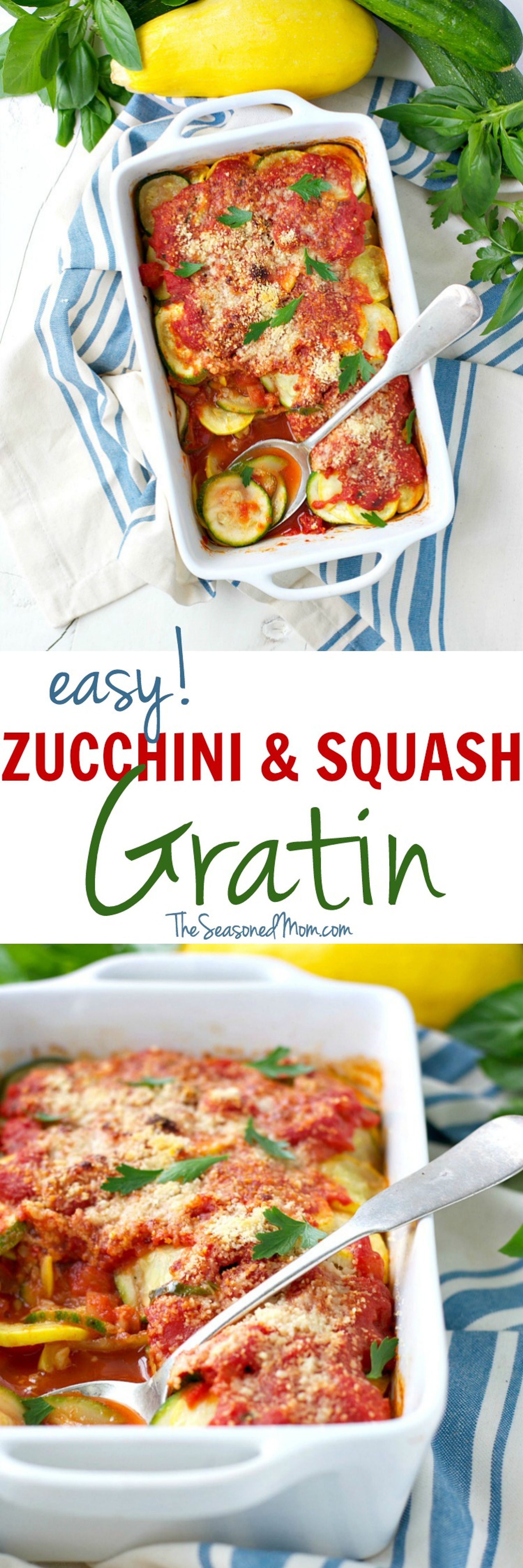 You can never have too many zucchini recipes at this time of year, right?! With layers of zucchini, summer squash, tomatoes, herbs, and Parmesan cheese, this Easy Zucchini and Squash Gratin is a healthy, clean eating side dish to enjoy for the season!