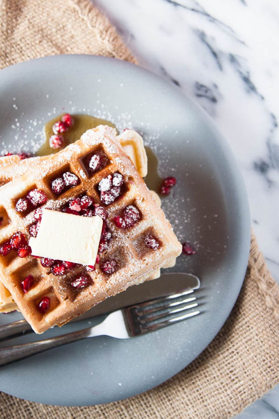 Eggnog waffles are creamy, fluffy, and sweetly spiced with nutmeg – they make a lovely holiday breakfast.