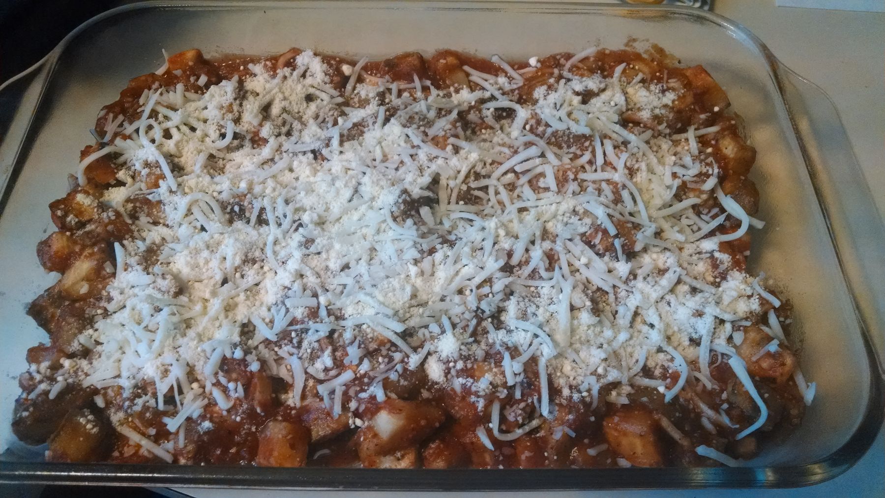 8. Transfer to baking dish and top with remaining mozzarella cheese and Parmesan cheese.