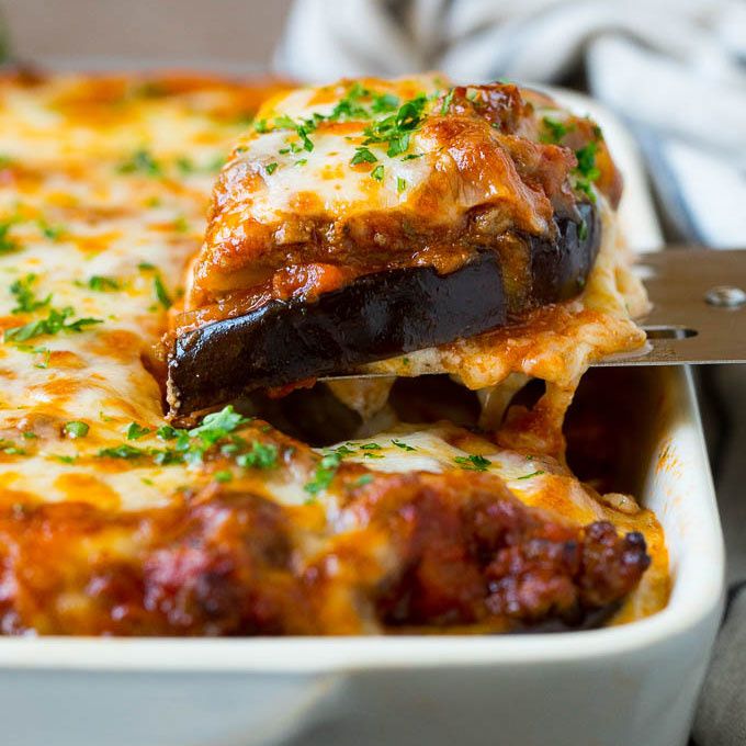 This eggplant lasagna is layers of roasted eggplant with meat sauce and three types of cheese, all baked to golden brown perfection. A low carb version of the classic pasta dish that always gets rave reviews!