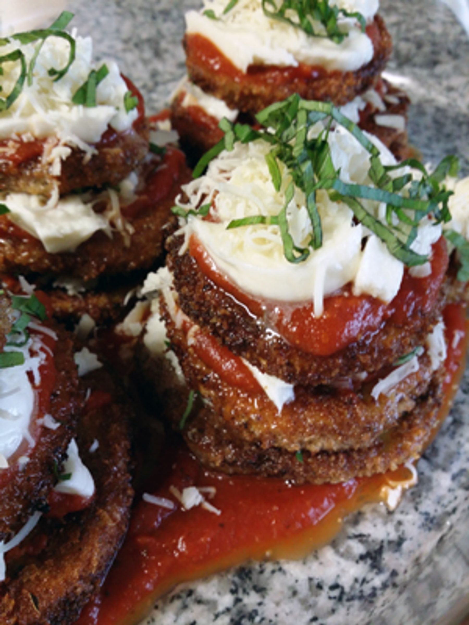 This is as mouthwatering as it looks! It takes some time and preparation--but well worth the effort! Your eggplant rounds will be the star of the show here, not the marinara.