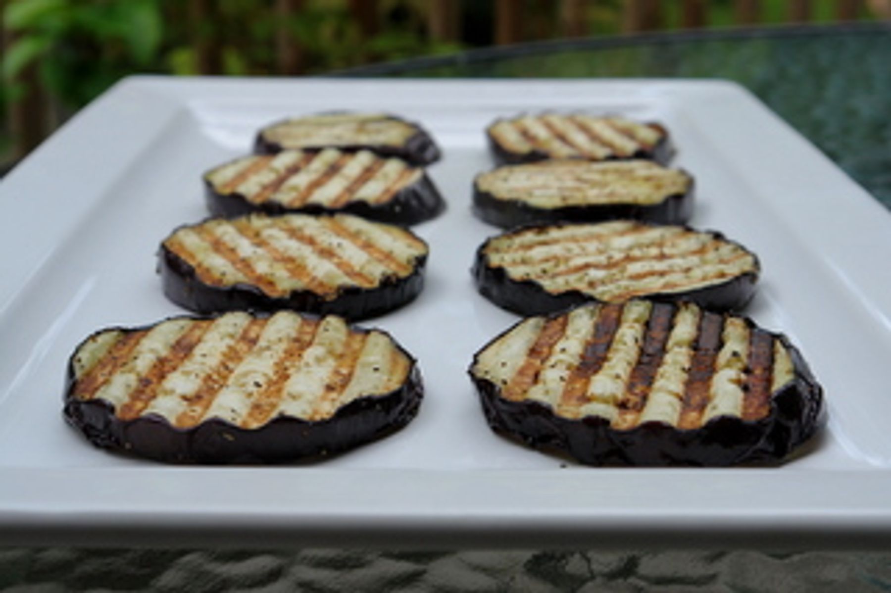 slice eggplants, toss with olive oil, salt and pepper, Grill until the eggplants slicers are cooked, about 5 minutes on electric grill. If you prefer you can also fry or bake them.