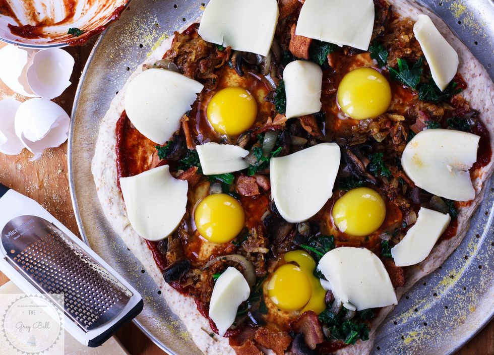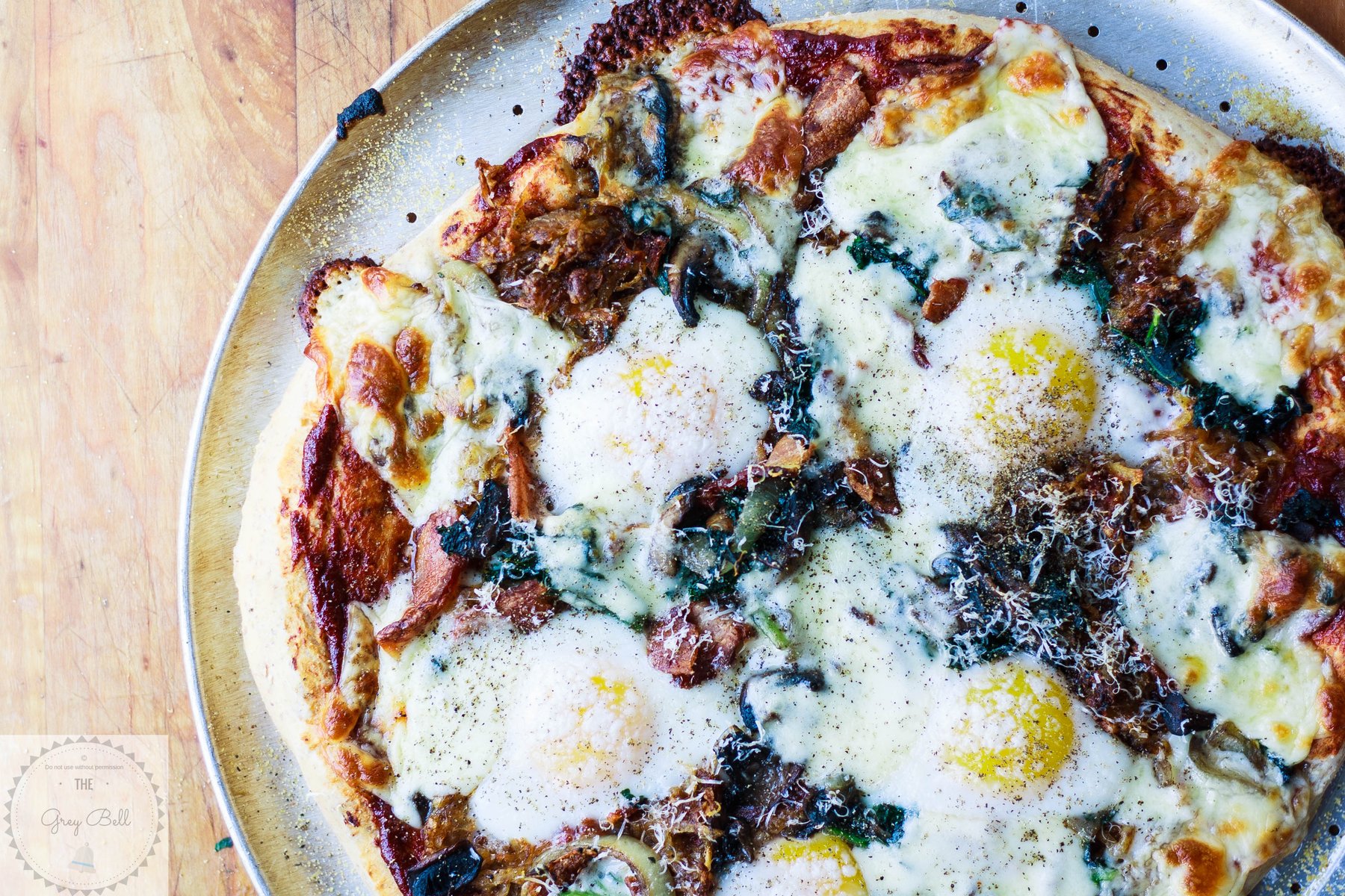 Eggs, bacon, onions, hash browns, mushrooms and kale spread on a crisp crust and covered with cheese. Your two favourite things come together to create an absolutely epic meal.